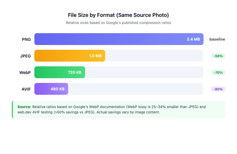 The newest option. AVIF can achieve over 50% savings compared to JPEG in some cases, with better quality at the same file size. Browser support is growing but not as universal as WebP yet. If your audience uses modern browsers, AVIF is worth considering for maximum compression.