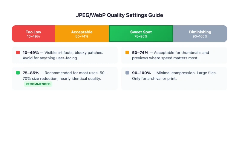 For most web use, 80% quality is a reliable default. It consistently produces files that look sharp while being small enough for fast page loads.